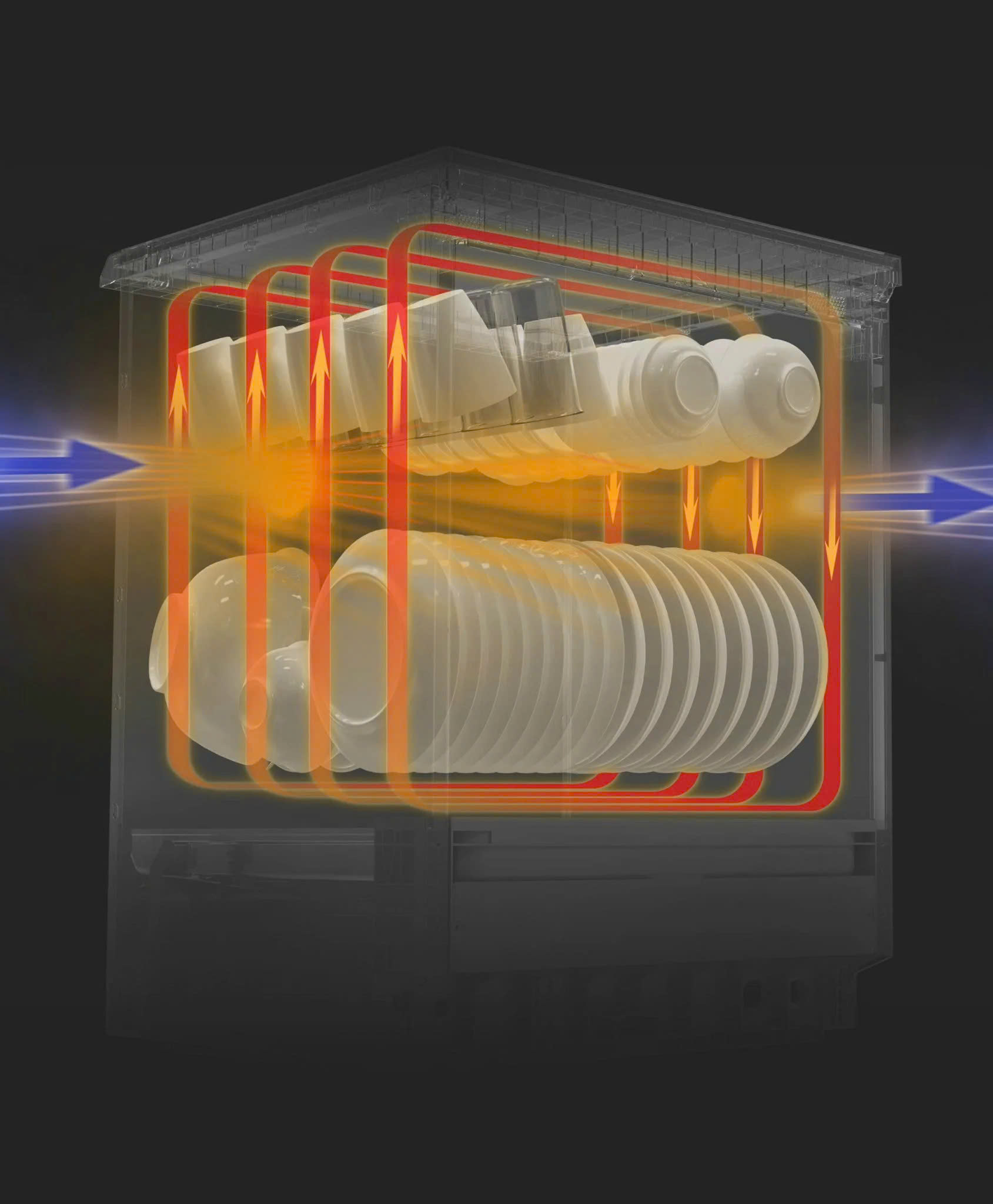 Hệ thống PTC sấy khô khí nóng: Sau khi quá trình rửa chén bát hoàn tất, máy sẽ dẫn không khí tự nhiên bên ngoài thông qua bộ gia nhiệt PTC để tạo thành luồng khí nóng thổi vào khoang máy và nhanh chóng lấy đi hơi ẩm còn tồn lại, giúp cho các bộ đồ ăn được sấy khô hoàn toàn