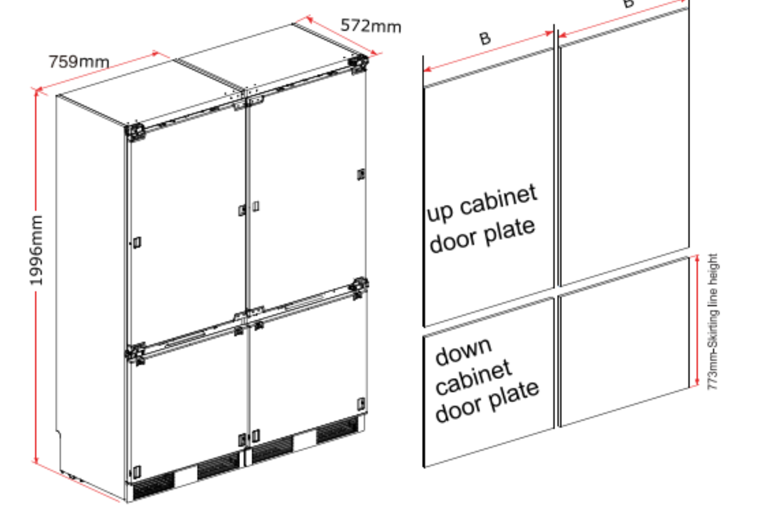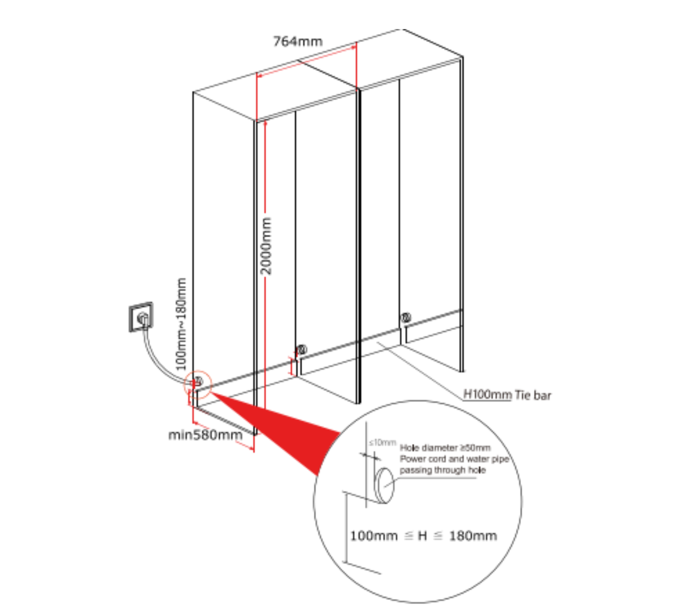 • Kích thước âm tủ (Product Dimensions): 764R x Min580S x 2000C mm
